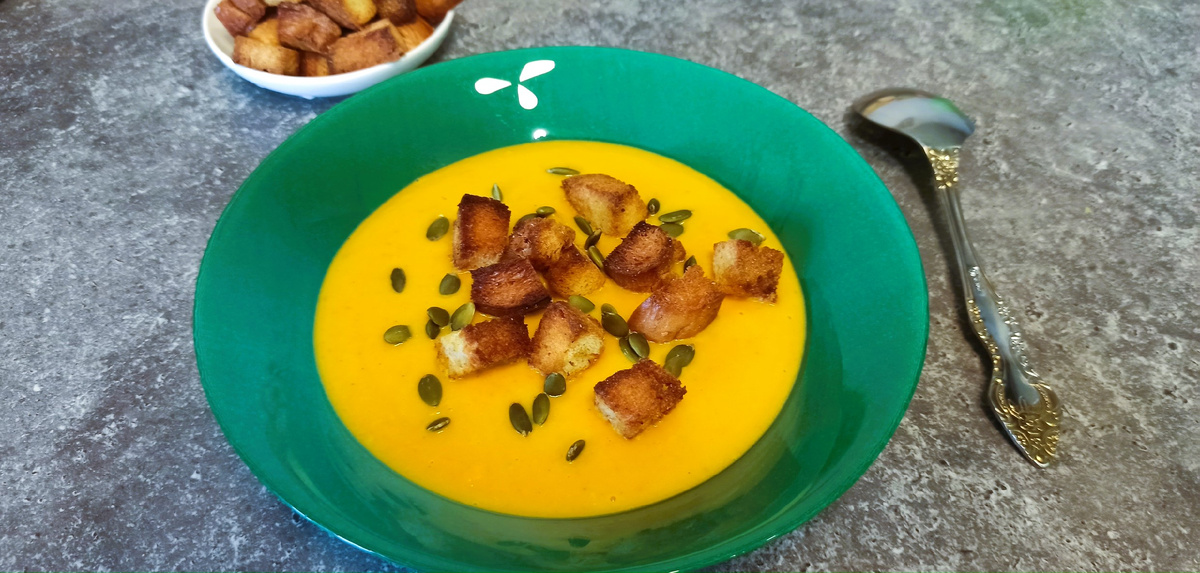 Разливая суп по тарелкам, сверху добавьте хрустящие сухарики и щедро посыпьте тыквенными семечками. Это не просто блюдо — это согревающее угощение, которое обязательно понравится всем членам семьи.