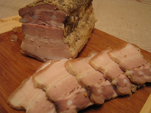Грудинка, завернутая в несколько слоев фольги, запекается целых пять часов при ста градусах. После этого важно дать ей остыть, а затем оставить в холодильнике на ночь. Это дает возможность всем вкусам сочетаться и углублять аромат.