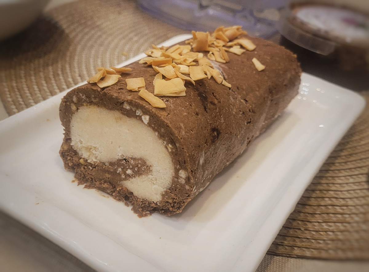 Теперь пласт с шоколадной массой выкладывается на пленку в форме прямоугольника и сверху добавляется кокосовый слой, который должен быть немного меньше шоколадного. С помощью пленки сворачивают рулет, формируя аккуратный десерт, который затем отправляется в морозильник на 40-60 минут. Разрезав на порционные кусочки, можно насладиться сладким и питательным лакомством! Приятного аппетита!