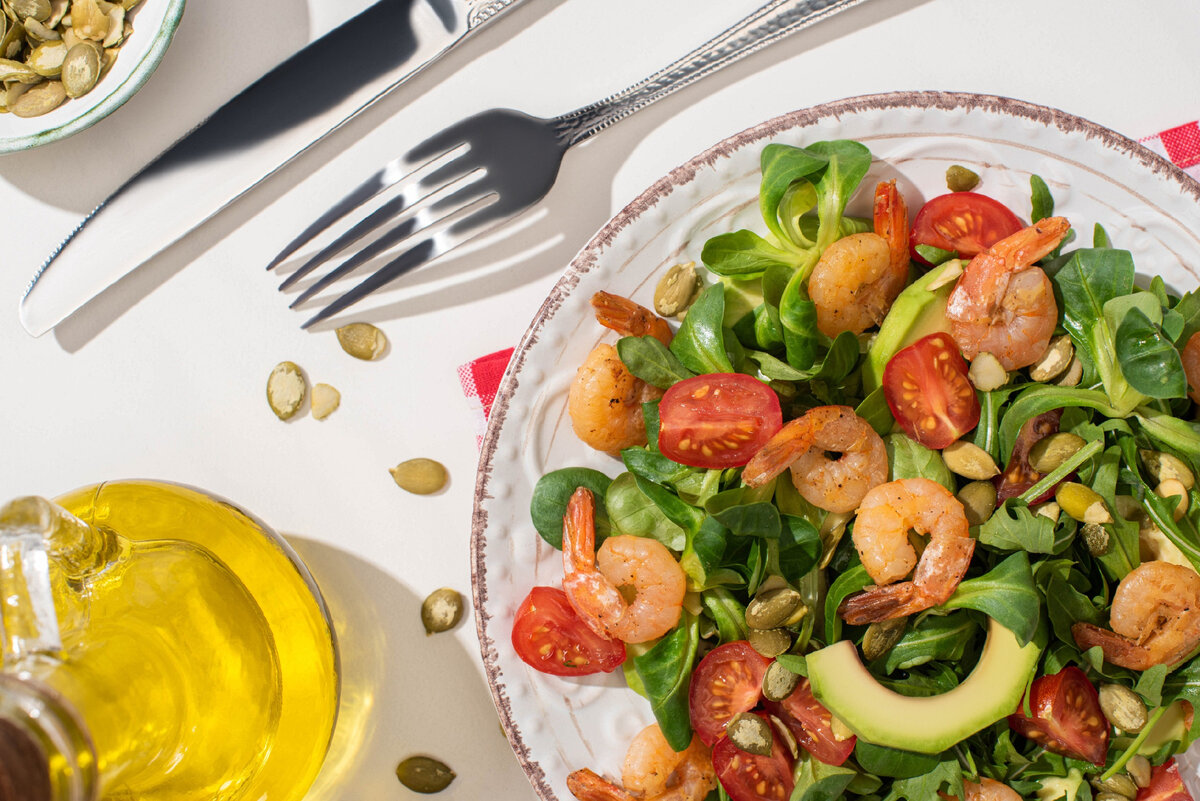 В готовый салат добавить обжаренные креветки или курицу, посыпать тертым сыром и полить соусом. Тщательно перемешать для равномерного распределения вкусов.