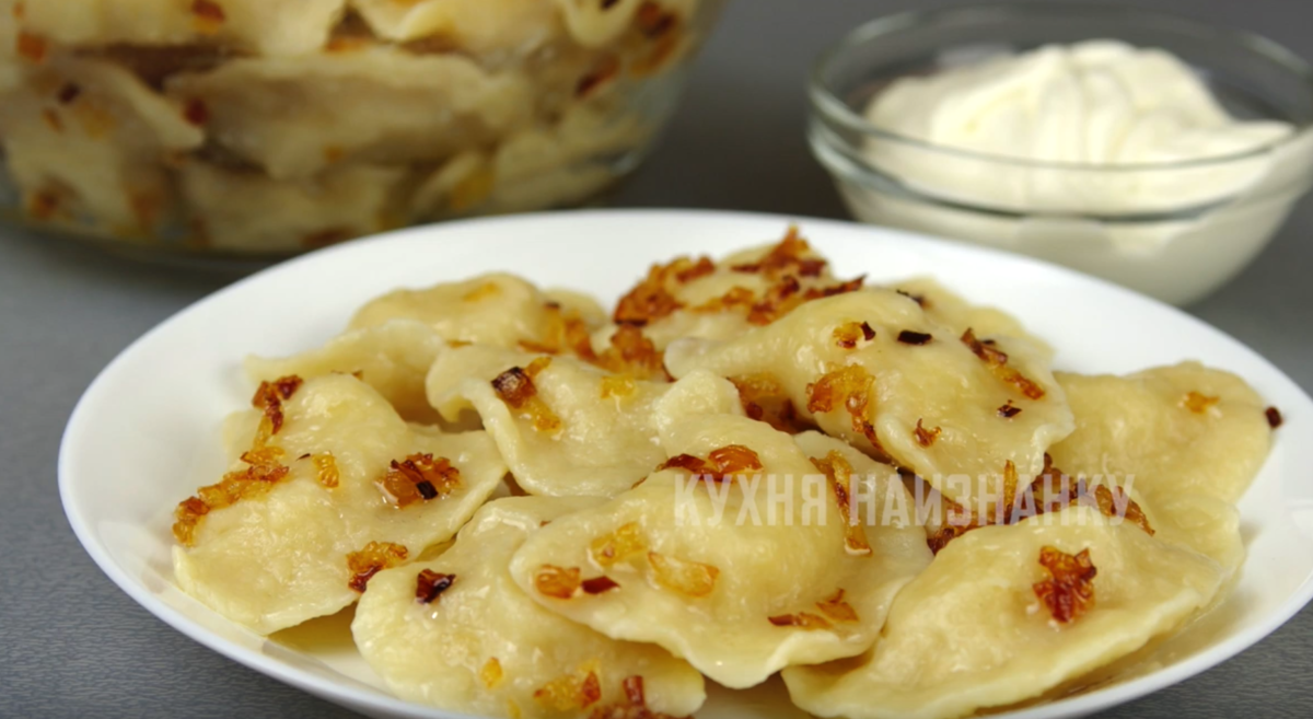 Варите в подсоленной воде. Как только вареники всплывут, готовьте их еще 2-3 минуты, затем аккуратно доставайте и выкладывайте в глубокую тарелку. Обязательно посыпьте их обжаренным луком. Это придаст им невероятный вкус! Не забудьте дополнить блюдо сметаной.