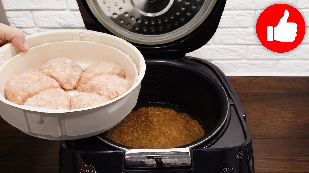 Гречку следует предварительно промыть и выложить в чашу мультиварки. Затем добавьте в нее соль и воду. Сверху установите корзину для пара с подготовленными котлетами. Запустите режим «Рис/Крупы», и через 40 минут вас ждет прекрасный обед!