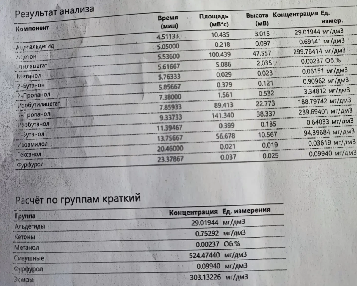Уровень сивушных спиртов составил 524 мг/дм?, что является нормой. Дистиллят имеет мягкий, ровный вкус, но недостаток маслянистости может оставить ощущение легкости, если ожидается более насыщенный характер. Также анализ показал, что пропанола и изобутанола достаточно, однако изоамилола не хватает для достижения полноценного зернового профиля. Это указывает на то, что итоговый вкус оказался скорее легким и аккуратным.