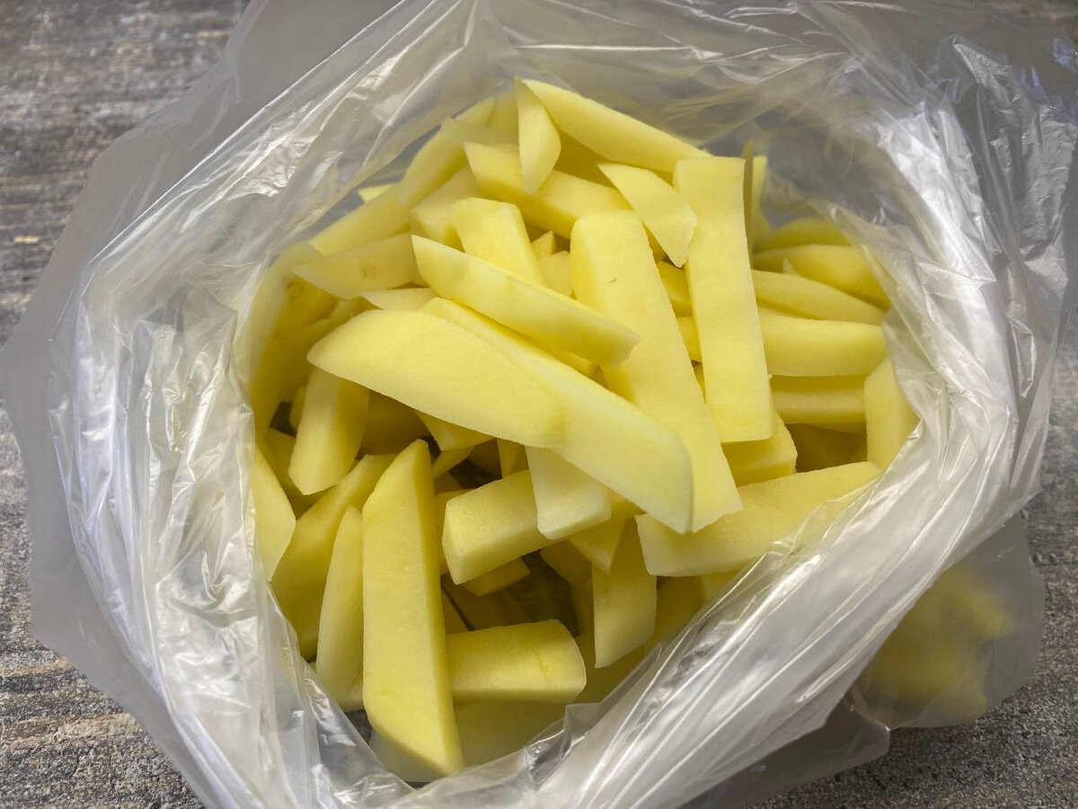Первым делом картофель нужно очистить и нарезать брусочками одинаковой толщины. Далее, переложить их в миску, залить водой и тщательно промыть, сменяя воду 2-3 раза.