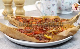 Теперь, чтобы завернуть рыбу, нужно вырезать из пергамента две лодочки. Филе рыбы укладывается на дно каждой лодочки, затем сверху размещаются обжаренные овощи. Запечатать края пергамента с помощью ниток и отправить в разогретую духовку.