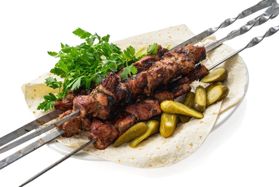 Сначала подготовить все необходимые ингредиенты.Розмарин мелко нарубить вместе с кинзой.Мясо нарезать на куски и положить в пакет.В отдельной миске смешать пассату, темное пиво и соевый соус.Добавить рубленую зелень в смесь и тщательно перемешать.Смешать толченые семена кориандра и хмели-сунели, затем добавить в маринад.Залить маринад в пакет с мясом, хорошо закрыть его и помассировать, чтобы соус равномерно распределился.Оставить маринующееся мясо в холодильнике минимум на 2 часа, а лучше на всю ночь.Перед жаркой достать мясо, обсушить его и дать немного нагреться до комнатной температуры.Разжечь мангал и насадить мясо на шампуры.Обжаривать шашлык до появления румяной корочки, проверяя готовность, протыкая ножом — сок должен быть прозрачным.Готовый шашлык подавать горячим, украсив свежей зеленью и овощами на лаваше.