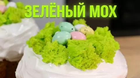 Приклеить 'мох' можно на еще не затвердевшую глазурь кулича, растопленный шоколад или крем. Для создания 'земли' можно использовать измельчённое печенье Oreo. Эта идея отлично сочетается с цукатами, орехами или шоколадными фигурками в виде зайцев и перепелиных яиц.
