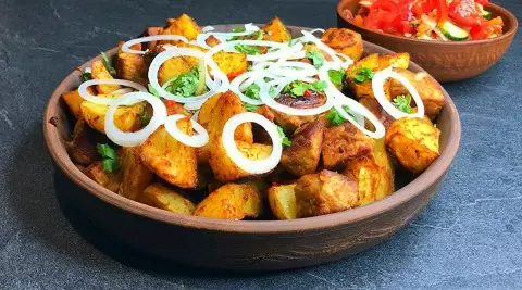 Первым делом берут картофель. Его очищают и нарезают большими кусочками, затем помещают в глубокую миску. Добавляют соль, черный молотый перец, кориандр и паприку. Вливают растительное масло и тщательно перемешивают, чтобы специи равномерно распределились. Затем картофель выкладывают на противень, который покрыт пекарской бумагой, и помещают в духовку, разогретую до 180 градусов, на 60 минут. Хотя картофель можно также обжарить, запеченный вариант позволяет сохранить более насыщенный вкус.