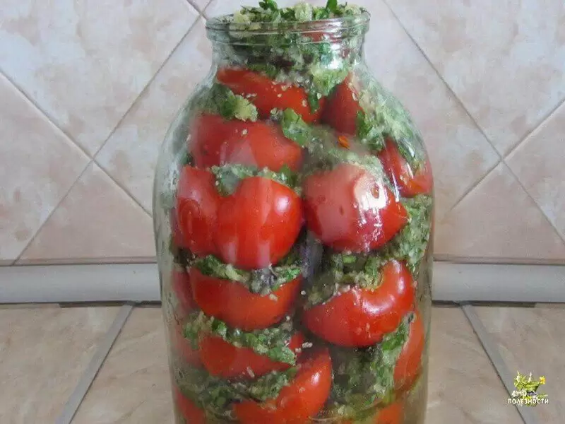 3. Помидоры нарежьте пополам или на четвертинки, а затем выложите их в трехлитровую банку, чередуя слои с заправкой, чтобы они пропитались ароматами.