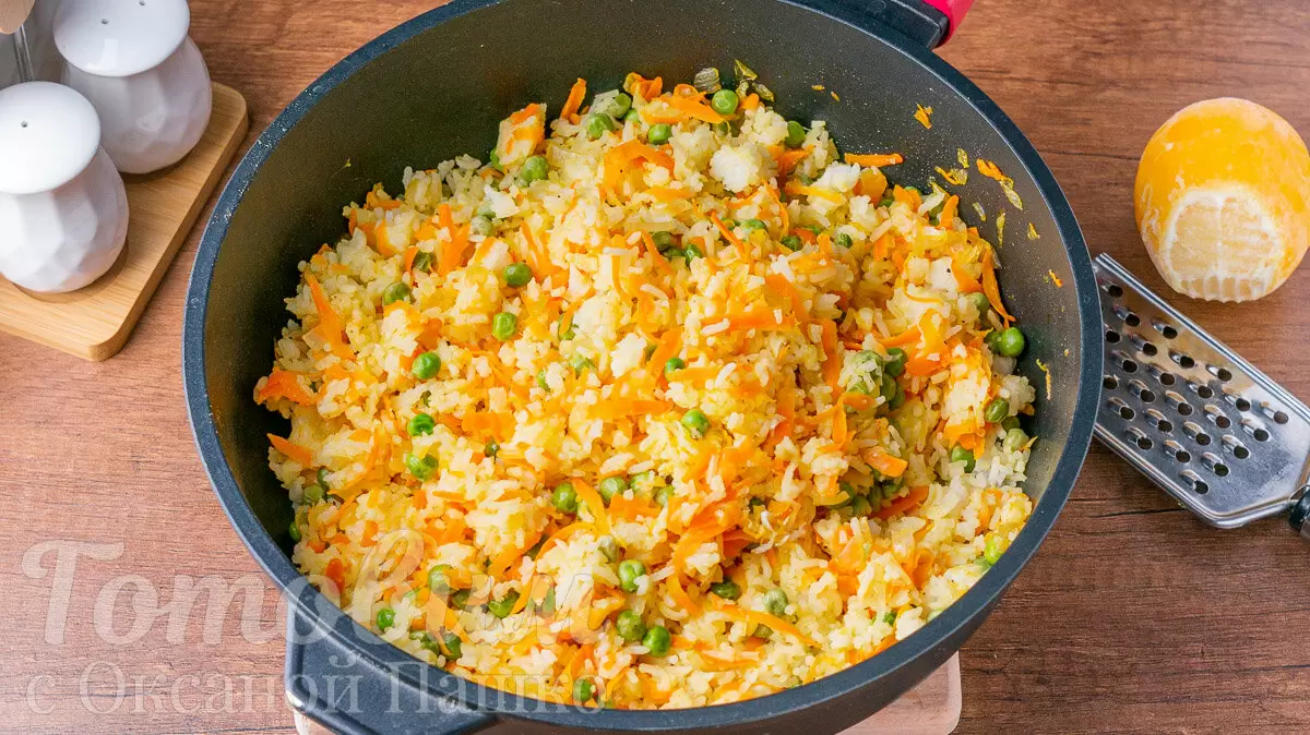 5. Добавьте готовый рис к овощам и хорошо перемешайте. Не забудьте немного поперчить.