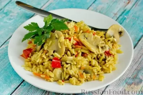 Еще один замечательный вариант – рассыпчатый рис с грибами, сладким перцем и сельдереем. Приготовленный на сковороде с добавлением чеснока и куркумы, он порадует не только вкусом, но и красивым цветом. Это блюдо станет отличной основой для вашего обеда или семейного ужина.