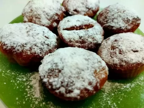 Тесто должно быть немного гуще, чем для оладий, и его перливаем по формочкам, заполняя их на 2/3 объема. Выпекаем в разогретой до 180°C духовке примерно 25–35 минут. Для проверки готовности используем деревянную шпажку: если она выходит сухой, кексы готовы!