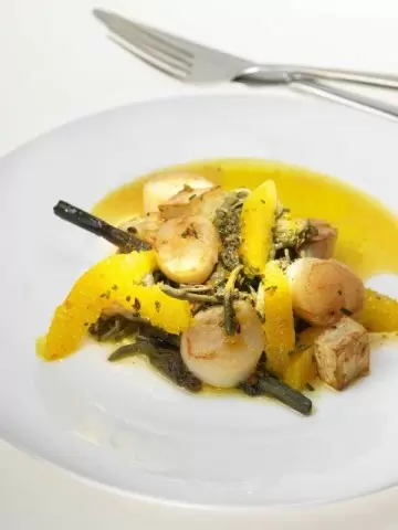 Промыть папоротник и замочить его в 75 мл оливкового масла на 15 минут. После этого масло слить.Корень сельдерея нарезать средними кубиками и отварить до почти полной готовности.Один апельсин очистить, разделить на дольки и удалить пленку. Из оставшихся апельсинов выжать сок. Лук мелко нарезать.Выпарить апельсиновый сок на слабом огне до состояния сиропа, затем смешать с облепиховым вареньем. Посолить и поперчить по вкусу.Обжарить кубики сельдерея на сливочном масле до золотистой корочки, морские гребешки до легкого румянца с обеих сторон, а папоротник — чуть-чуть.В теплый соус добавить оставшееся оливковое масло, дольки апельсина и лук. После этого добавить переваренный сельдерей, грибы и папоротник. Аккуратно перемешать и разложить по тарелкам.