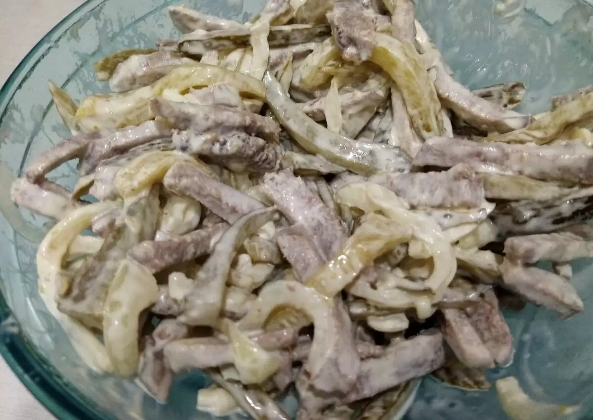 Главной частью этого блюда является отварное мясо, которое задает насыщенный вкус салату. Процесс использования мяса может быть разнообразным: подойдет как говядина, так и свинина, а также различные субпродукты, такие как печень или сердце. Если используются более доступные варианты, куриная или индюшечья печень станет отличной заменой.