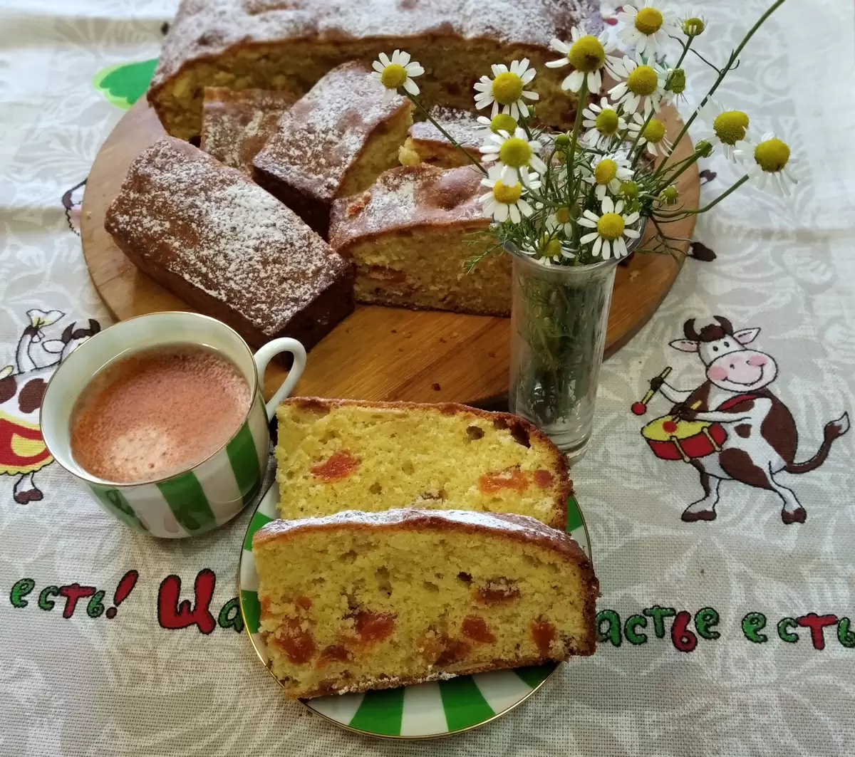 Как только пирог готов, его можно слегка посыпать сахарной пудрой, хотя он и сам по себе очень вкусный. Выпечка получается слегка влажной и ароматной, а при нарезании не крошится. Это идеальный выбор для уютного чаепития или семейного праздника!