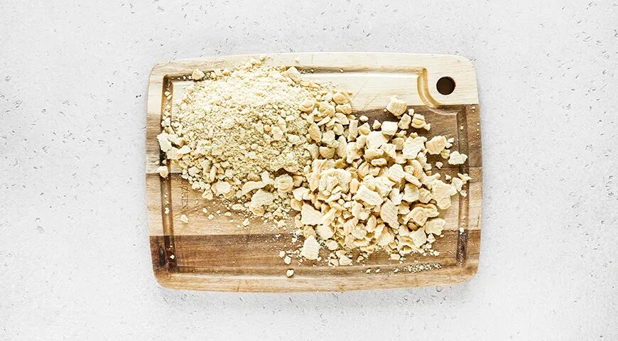 Первым делом, печенье нужно поломать на мелкие кусочки, а затем разделить его на две части. Половину печенья следует тщательно истолочь – это станет основой для «мясной» части колбасы. Мелкие кусочки – это «шпик», который придаст оригинальности десерту.
