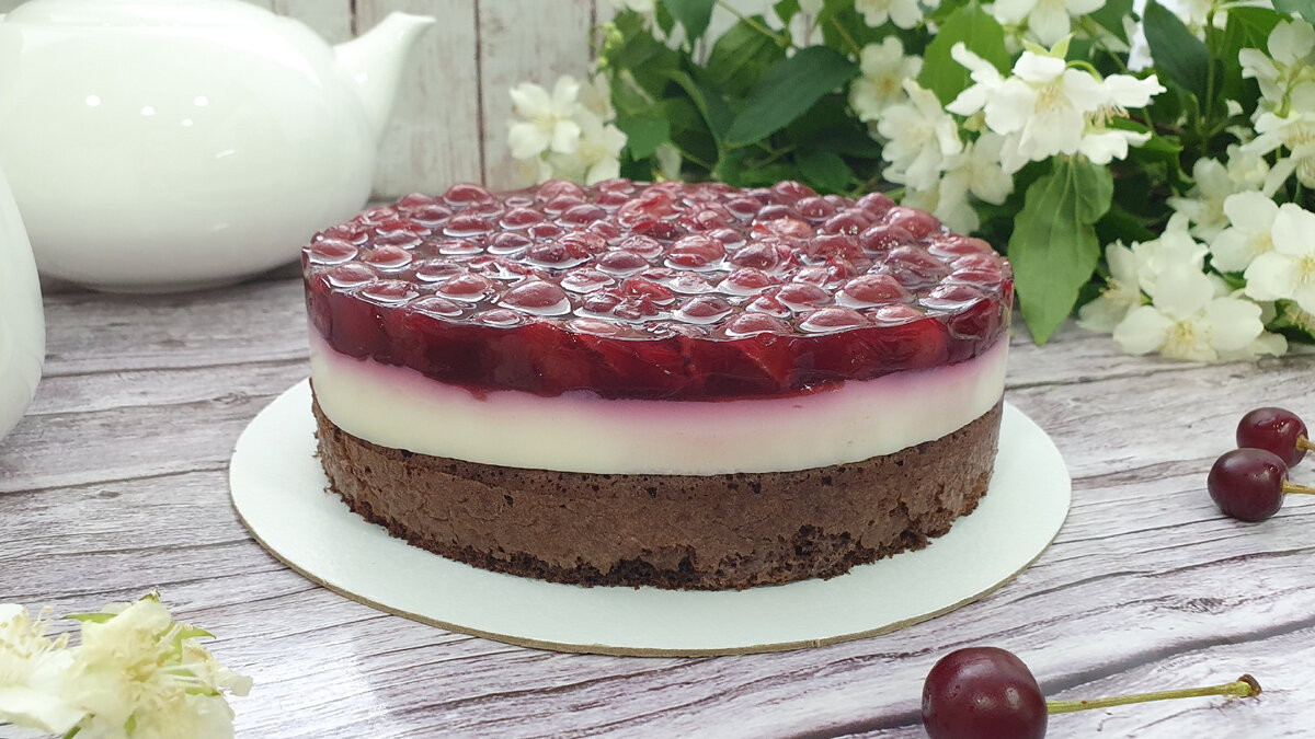 Ягодный слой. Вишню доведите до кипения с водой и подсластителем, остудите, после чего добавьте замоченный желатин. Уложите ягодный слой на застывший мусс и дайте настояться еще 6 часов. Торт готов к подаче!