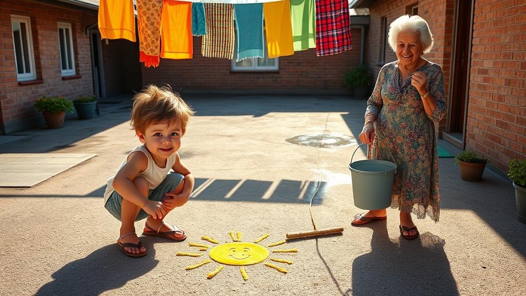 С каждым новым штрихом на асфальте появлялись яркие лучи — тонкие и неровные, но каждый из них был уникален. Общение между бабушкой и внуком добавило теплоты к их совместному творчеству: один луч был окрашен в жёлтый, другой запомнил оттенок предыдущей лужи, а третий возник из улыбок, объединяющих поколения.