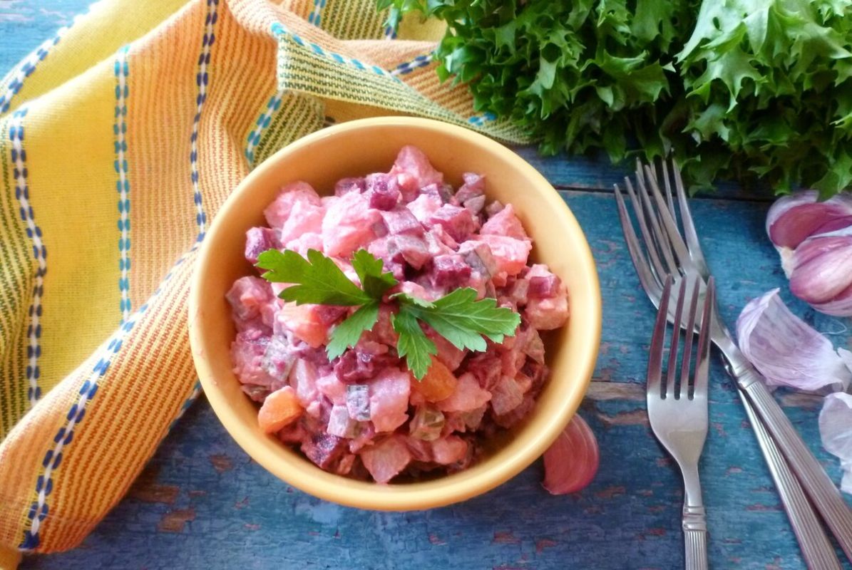 Салат, который внешне может напомнить классический винегрет, на самом деле является совершенно новым гастрономическим опытом. Благодаря добавлению чеснока и заправке майонезом, его вкус оказывается насыщенным и сытным. Несмотря на сходство с привычным салатом, этот рецепт предоставляет уникальный и неожиданный букет ароматов.