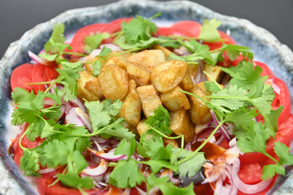 Сначала баклажаны необходимо очистить от кожицы с помощью овощечистки и нарезать кубиками среднего размера. Для того чтобы избавиться от горечи, их стоит замочить в подсоленной воде на некоторое время.Томаты нарезаются дольками, а лук — полукольцами. Лук можно слегка помять руками, чтобы он выделил сок. Кинзу стоит нарвать на мелкие кусочки.На красивую тарелку выложите томаты, а сверху разместите лук, чтобы он подмариновал их своим соком, пока баклажаны обжариваются.Баклажаны отожмите от лишней влаги и обваляйте в крахмале перед обжариванием.Обжарьте баклажаны в раскалённом масле до золотистой корочки. Дайте им немного отдохнуть, затем обжарьте ещё раз для лучшей хрустящей текстуры.Чтобы определить, готово ли масло, опустите в него листик кинзы — пузырьки вокруг него укажут на то, что масло достигло нужной температуры.Готовые баклажаны выкладываются на бумажное полотенце для удаления излишков масла.В глубокой тарелке смешайте баклажаны с соусом терияки, стараясь сохранить хрустящую текстуру.Подайте блюдо, украсив его свежей кинзой для дополнительного аромата.Салат с хрустящими баклажанами готов! Приятного аппетита!