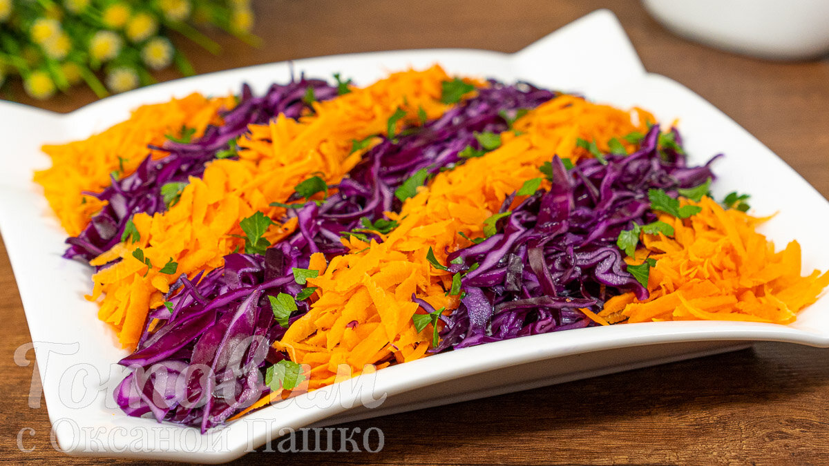 Салат из краснокачанной капусты поражает не только своим вкусом, но и привлекательным внешним видом благодаря контрастным полосам моркови и капусты. Добавляя чеснок, блюдо получает пикантность, что делает его идеальным выбором для витаминизации как себя, так и своих близких.