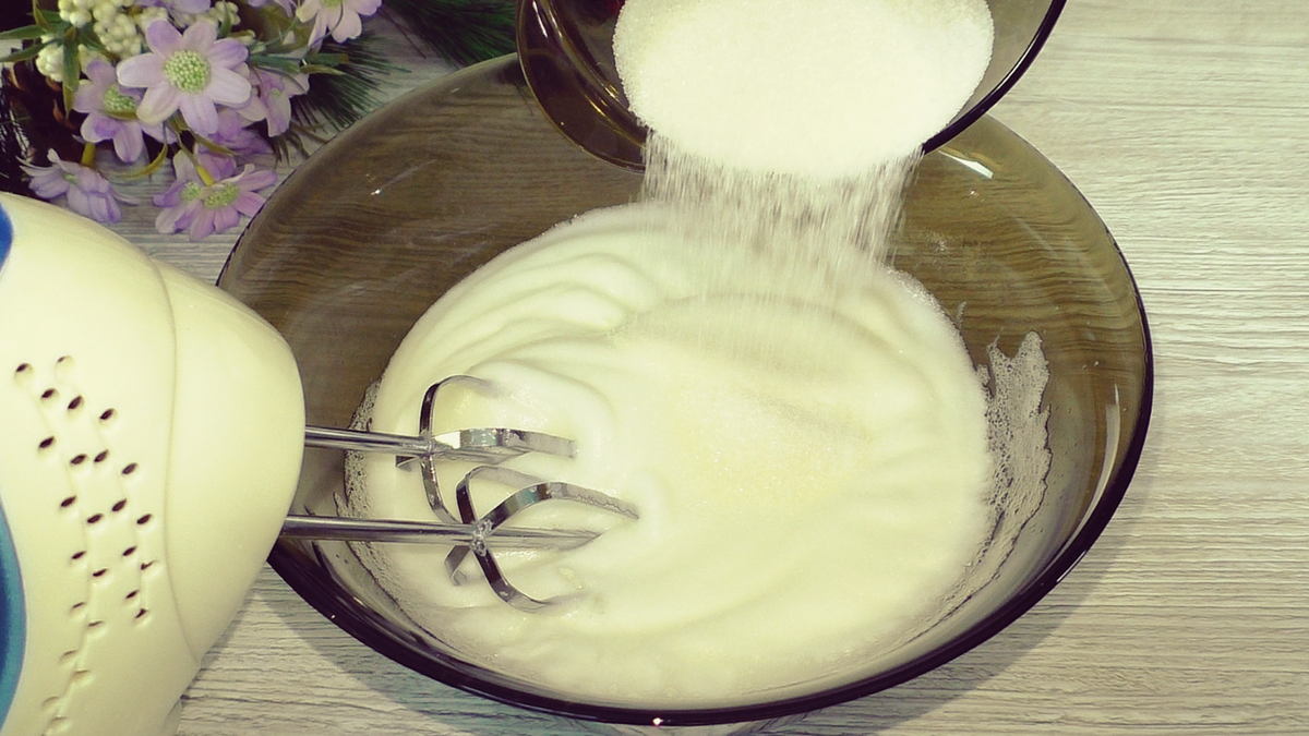 - Белковое тесто: 5 яичных белков, щепотка соли, 100 г сахара, 50 мл молока, 50 мл подсолнечного масла, 150 г муки, 5 г ванильного сахара, 5 г разрыхлителя.