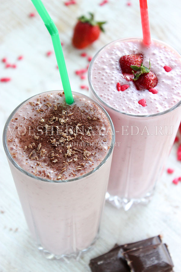Далее клубнику следует измельчить в пюре при помощи погружного блендера. После этого в смесь вливается холодное молоко, и всё взбивается до получения однородной текстуры. Рекомендуется использовать молоко с жирностью от 3,2%, поскольку оно придаёт коктейлю насыщенность и кремовость.