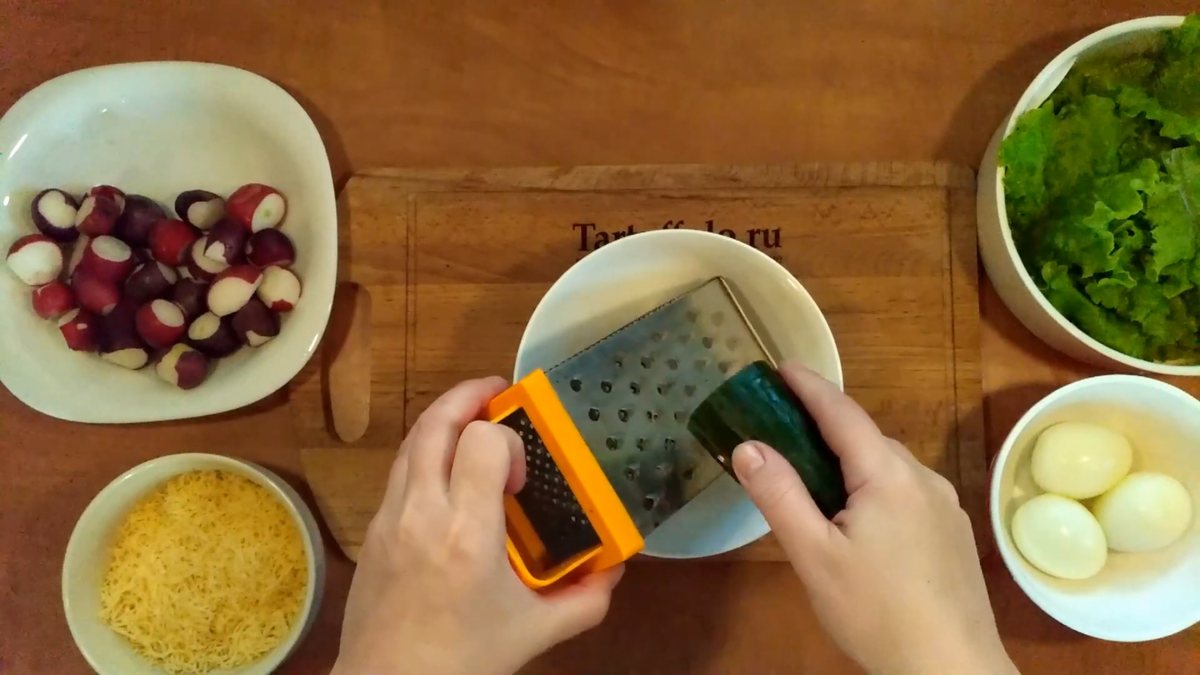 Первым делом стоит заняться овощами. Огурец очищают и натирают на крупной тёрке. Затем берут большой пучок редиса, также натирают его. Если есть желание упростить процесс, можно воспользоваться кухонным комбайном.