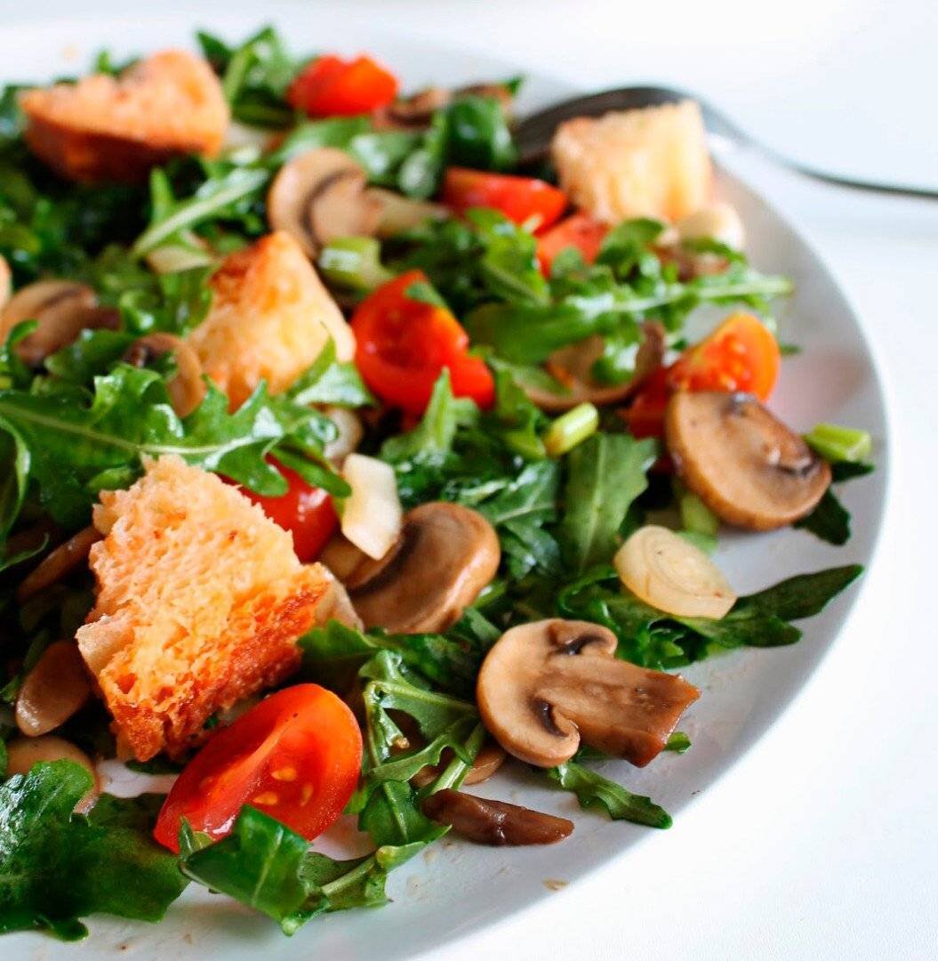 Финальные штрихи: На подготовленные листья выложить грибы с луком, помидоры и обжаренное куриное филе, приправить перцем и добавить капли оливкового масла. Сверху можно посыпать немного сухариков для хруста.