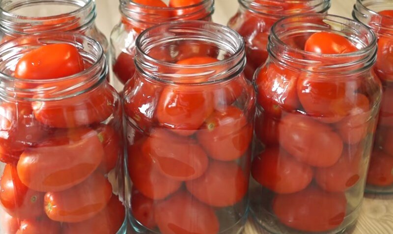 В стерильные банки укладываются помидоры, не заполняя их слишком плотно. Для их подготовки используют кипяток: банки заливаются горячей водой и накрываются крышками. После 20-25 минут, когда помидоры прогреются, воду сливают в кастрюлю.
