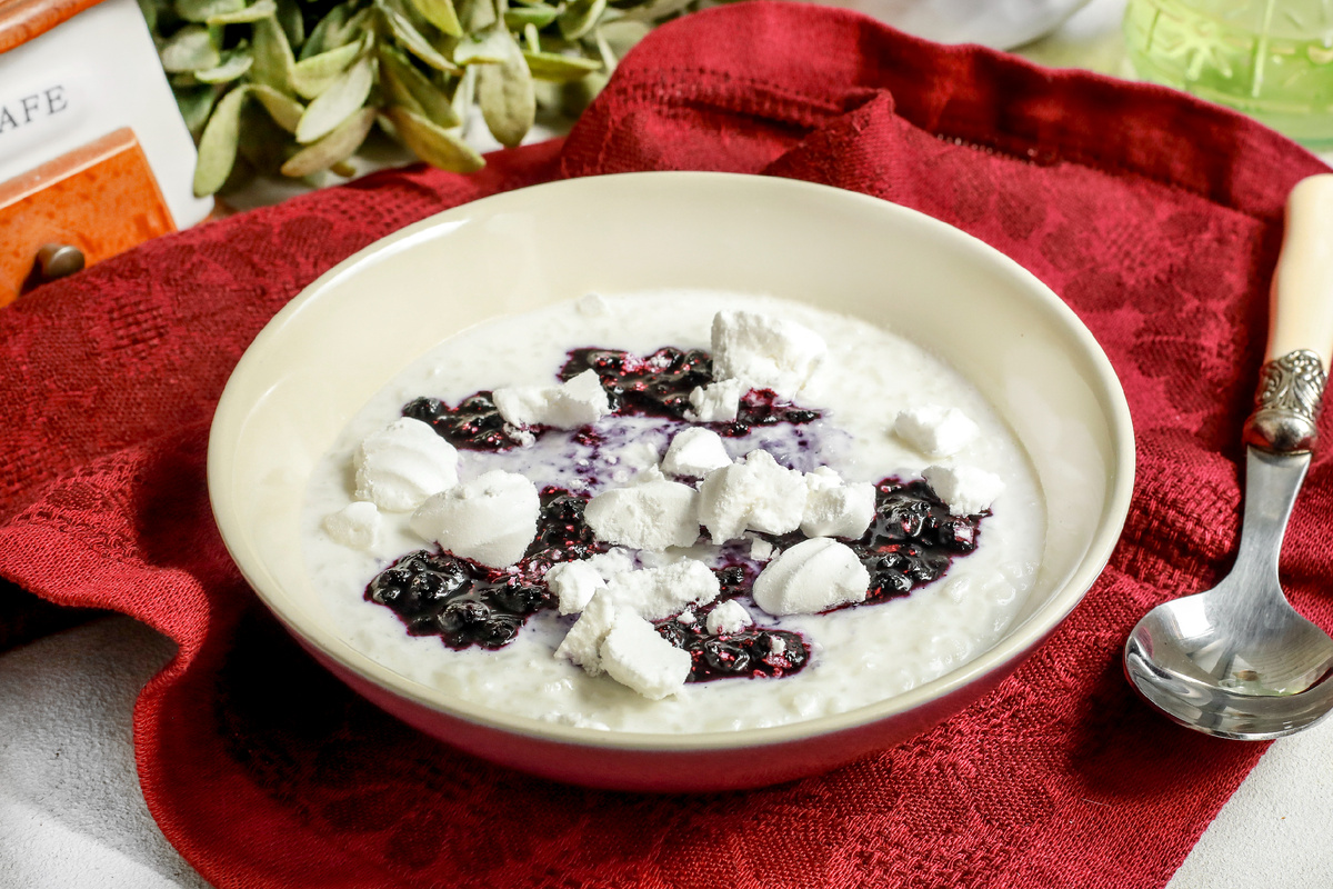 Шаг 2: В сотейнике соедините чернику с оставшимся сахаром. Нагревайте смесь до полного растворения сахара, не забывая помешивать. Поломайте безе на произвольные кусочки. Готовую кашу полейте ягодным соусом и посыпьте хрустящим безе для завершения.
