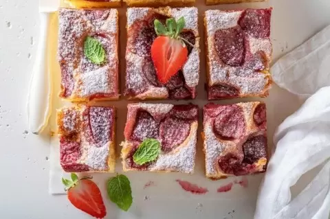 Сегодня представлен рецепт домашнего сладкого пирога с клубникой, который напоминает кекс и отличается необычайной легкостью. Пирог выпекается в квадратной форме, после чего нарезается на порционные дольки и посыпается сахарной пудрой. Дети особенно ценят такую нежную текстуру.
