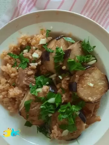 Спустя 10-15 минут, когда булгур будет готов, выложите на него обжаренные баклажаны. Добавьте рубленный чеснок и зелень, прогрейте под крышкой пару минут, и ваше ароматное блюдо готово к подаче.