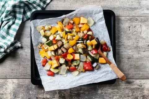 Приготовление: нарежьте крупными кубиками 200 г моркови, 150 г болгарского перца, 200 г баклажанов, 150 г шампиньонов и 70 г красного лука. Выложите всё в форму для запекания, слегка посолите, добавьте чёрный перец и одну столовую ложку оливкового масла. Перемешайте и запекайте при температуре 180°C в течение 25-30 минут. В завершение можно добавить тимьян или розмарин.