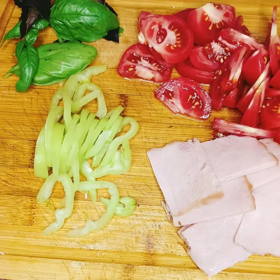 Первым делом нарезаем лаваш вдоль на длинные прямоугольники. Начинка может варьироваться по желанию — идеальными ингредиентами станут помидоры, ветчина, перец и базилик, не забыв про сыр.