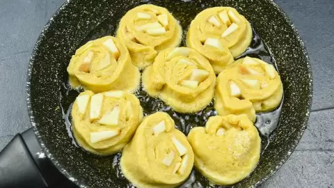 Следующий шаг — подготовка яблок. Нарежьте их не слишком толстыми дольками. Раскатайте тесто в пласт, на него выложите яблоки, после чего сверните в рулет и нарежьте на порции.
