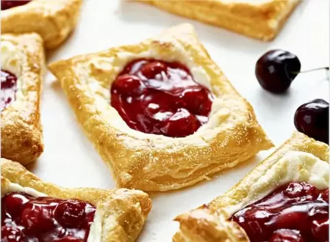Вы просто размораживаете тесто, наполняете его сливочной смесью, добавляете вишневую начинку — и запекаете до аппетитного золотистого цвета. Эти слойки станут отличным началом дня или же вкусным компаньоном к чашечке кофе во время перерыва на работе.