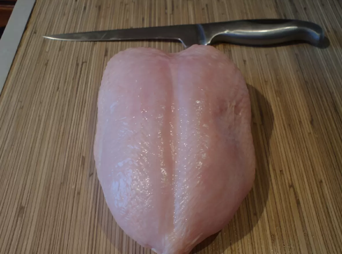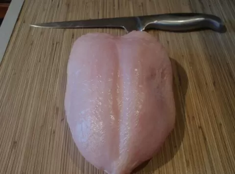 Первым делом стоит подготовить мясо. С помощью острого ножа следует аккуратно отделить филе от костей. Разделив грудку на две половинки, каждую из них нарезают методом «бабочка». Для этого нужно легкими движениями провести ножом по центру филе, не до конца, и раскрыть его, как книгу. Для идеальной порции получится сразу две сочные отбивные.