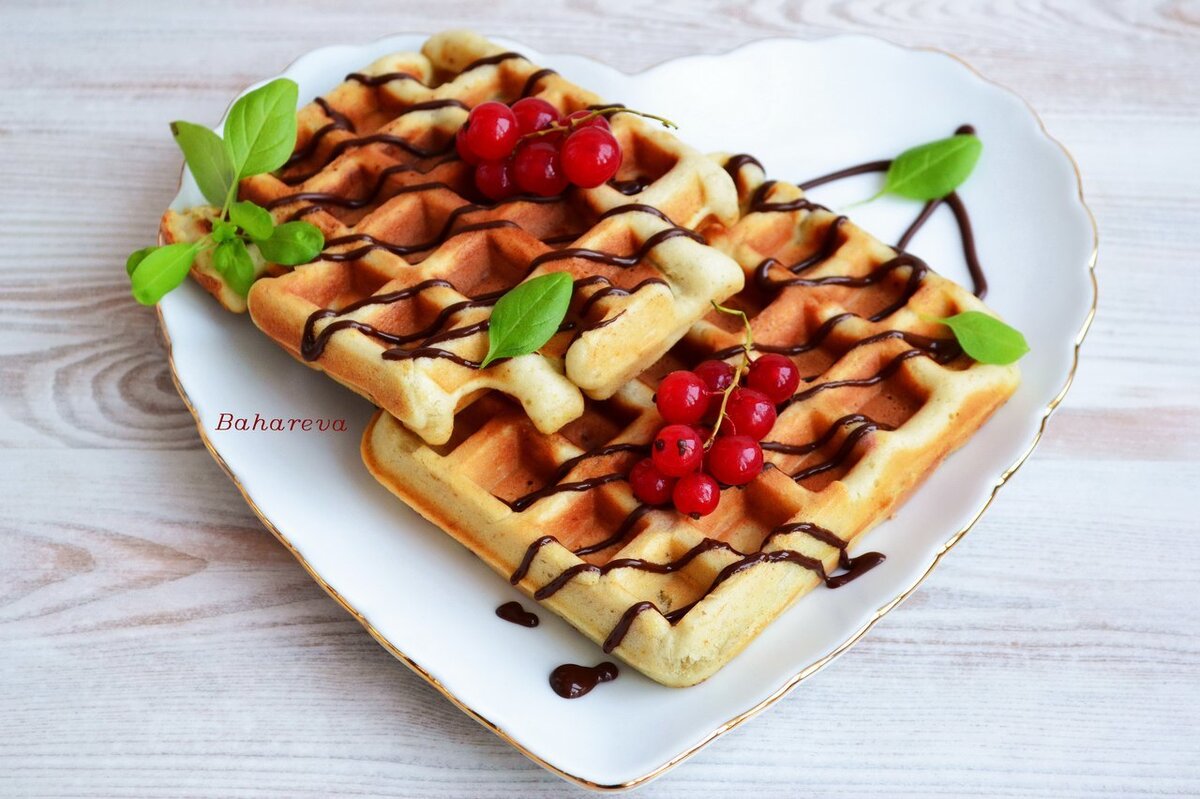 После этого вафельницу смазывают сливочным маслом и разогревают. Тесто заливают в формочки, закрывают, и готовят вафли в течение 5-6 минут, не забывая приоткрыть крышку, чтобы выпустить лишний пар. Готовые вафли следует полить растопленным шоколадом, который легко приготовить на водяной бане. По желанию вафли украшаются свежей красной смородиной и зеленью, такой как мята или базилик, для дополнительного вкусового акцента.