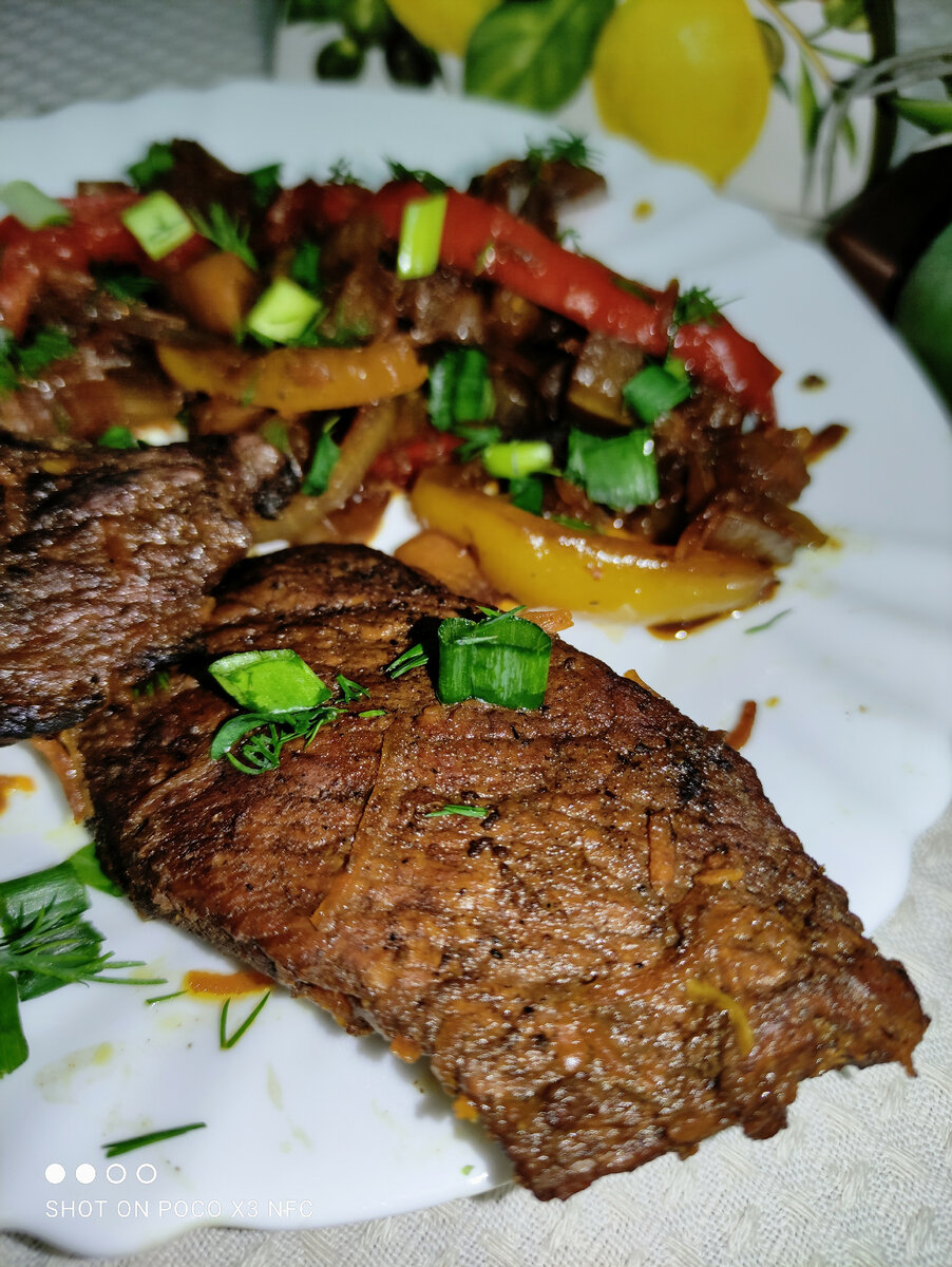 3. Приготовление: Обжарить стейки на небольшом огне под крышкой до полной готовности и золотистой корочки. Затем убрать их на тарелку, а в сковороду выложить подготовленные овощи. При необходимости можно добавить немного масла и тушить до мягкости. Не забудьте добавить оставшийся маринад.