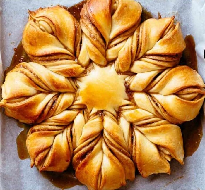 Нарезка выполняется от центра к краям на четное количество лучей. Лучи закручиваются и соединяются попарно, формируя снежинку. Верх мазать взбитым яйцом всего на 20-25 минут в духовке при 180 градусах. Результат — золотистая корочка, которая делает пирог привлекательным.